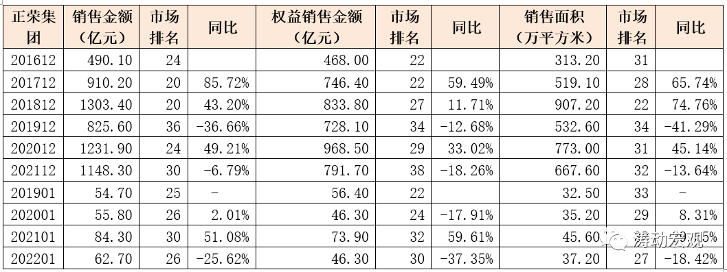 特別是若從2021年全年和2022年1月的銷售數(shù)據(jù)來看,正榮銷售端的壓力均比較突出,如銷售金額同比分別下滑6.79%和25.62%,權益銷售金額同比分別下滑18.26%與37.35%,銷售面積同比分別下滑13.64%與18.42%。
