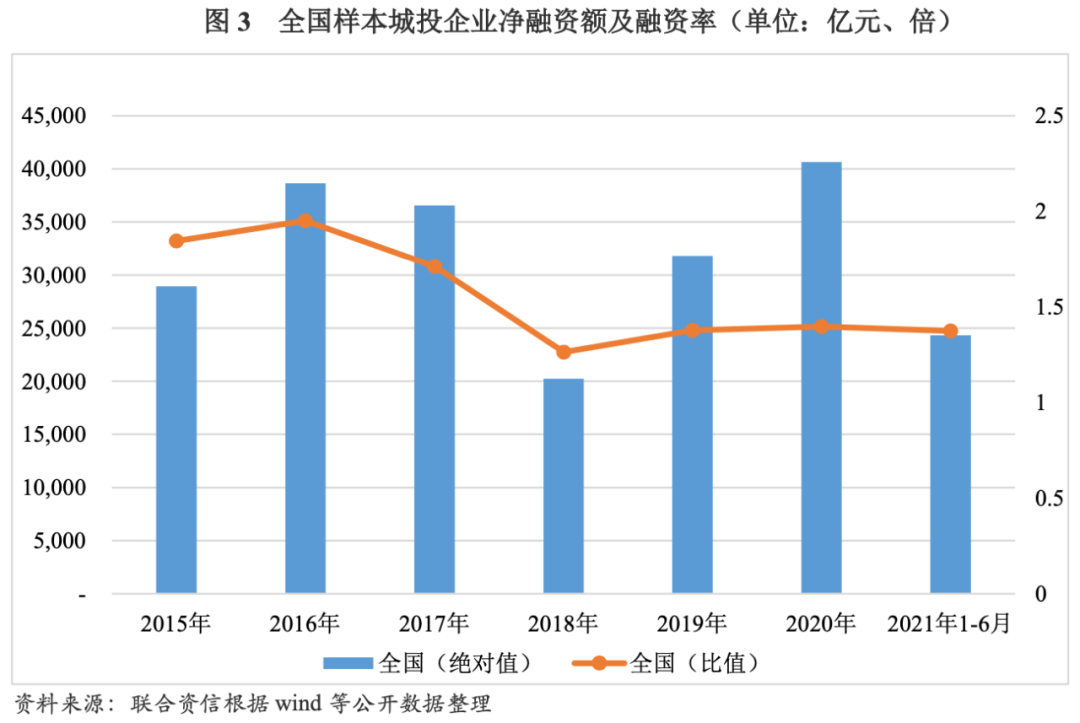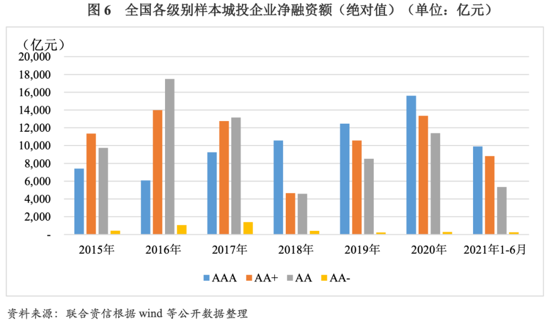 2015年至2021年上半年,樣本城投企業(yè)凈融資情況在絕對值和比值的表現(xiàn)形式下呈相同走勢,且與非金融企業(yè)杠桿率同趨勢變化。不同區(qū)域、信用級(jí)別樣本城投企業(yè)凈融資情況對監(jiān)管政策寬松程度的敏感及響應(yīng)速度有所不同,其中所在區(qū)域經(jīng)濟(jì)相對較弱、信用級(jí)別較低的樣本城投企業(yè)在監(jiān)管政策趨緊時(shí),外部融資環(huán)境更為嚴(yán)峻;區(qū)域經(jīng)濟(jì)相對較強(qiáng)、信用級(jí)別較高的樣本城投企業(yè)在嚴(yán)監(jiān)管下韌性較強(qiáng)。