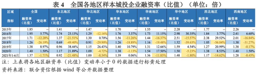 2016年,除華北地區(qū)外,其余地區(qū)融資率(比值)均較2015年有所增長,保持在1.5倍以上;2017年,除西北和華北地區(qū)融資率(比值)上升外,其余地區(qū)融資率(比值)均較2016年有不同程度的下降,其中東北地區(qū)經(jīng)濟(jì)相對薄弱,在監(jiān)管政策收緊時(shí),降幅最為明顯;華東地區(qū)融資率(比值)則表現(xiàn)出較強(qiáng)韌性,降幅最小。2019年6月《關(guān)于做好地方政府專項(xiàng)債券發(fā)行及項(xiàng)目配套融資工作的通知》出臺(tái),釋放基建項(xiàng)目融資利好消息,除了西南地區(qū)融資率(比值)略有下降外,其余地區(qū)樣本城投企業(yè)融資率(比值)均有所回升。2020年,新冠肺炎疫情對出口與消費(fèi)均造成不同程度的影響,我國經(jīng)濟(jì)增速放緩,基礎(chǔ)設(shè)施建設(shè)發(fā)揮托底效應(yīng),城投企業(yè)融資環(huán)境有所放松,東北地區(qū)、西北地區(qū)、華南地區(qū)及西南地區(qū)融資率(比值)較2019年均有不同程度增長,但基本在1.50倍以下。
