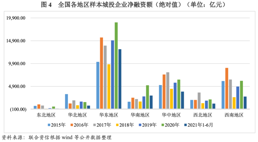 從區(qū)域分布來看,2015-2020年,華東、華南、西南地區(qū)樣本城投企業(yè)凈融資額(絕對值)變動(dòng)趨勢與全國樣本城投企業(yè)變動(dòng)趨勢大體一致。2016年降杠桿等綱領(lǐng)性文件印發(fā)后,上述三個(gè)地區(qū)紛紛響應(yīng),2017年凈融資額(絕對值)均較2016年有所減少,2018年受監(jiān)管政策持續(xù)收緊的影響,凈融資額(絕對值)分別降至2015年以來最低點(diǎn);此后兩年,我國加大逆周期調(diào)節(jié)力度,城投企業(yè)融資環(huán)境向好,華東、華南、西南地區(qū)樣本城投企業(yè)凈融資額(絕對值)保持增長。