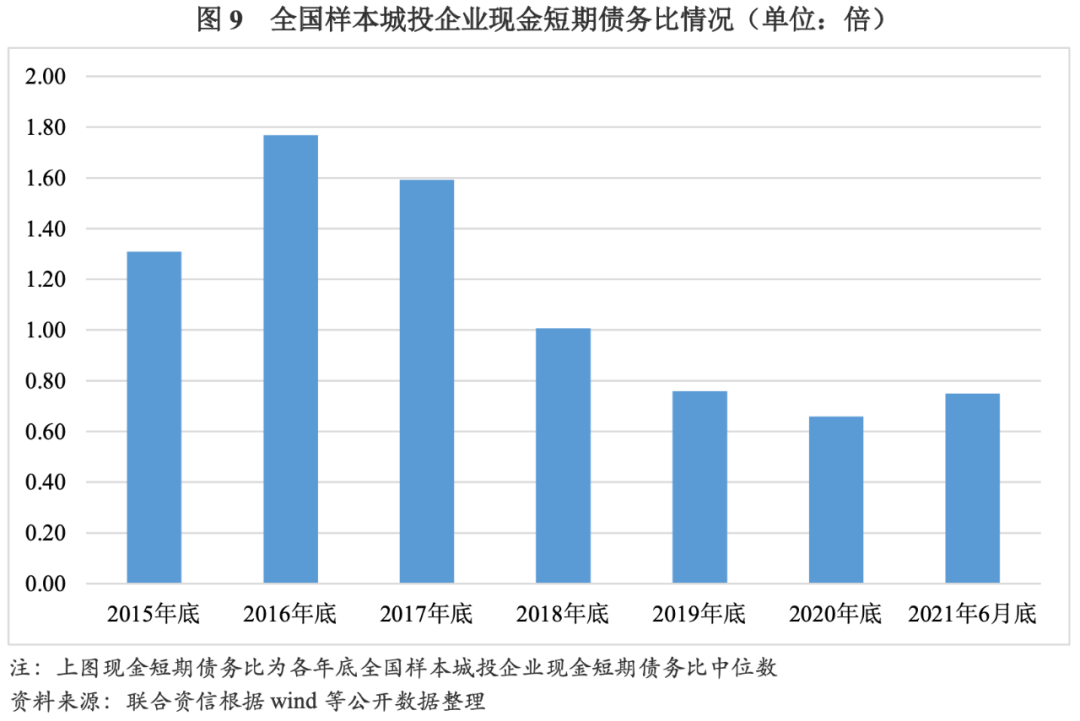 2015-2016年,全國信用政策較為寬松,2015年底和2016年底樣本城投企業(yè)現(xiàn)金短期債務(wù)比分別為1.31倍和1.77倍,整體流動(dòng)性水平尚可。2017-2020年,在降杠桿背景下,樣本城投企業(yè)現(xiàn)金短期債務(wù)比呈逐年下降趨勢,由2017年底的1.59倍降至2020年底的0.66倍,城投企業(yè)流動(dòng)性持續(xù)趨緊。其中,在監(jiān)管政策大幅收緊的2018年,樣本城投企業(yè)流動(dòng)性壓力顯著增加。2021年6月底,樣本城投企業(yè)現(xiàn)金短期債務(wù)比較2020年底有所上升,但仍存在一定流動(dòng)性壓力。