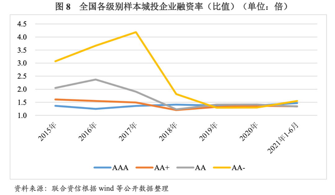 剔除企業(yè)規(guī)模對凈融資額的影響,以融資率(比值)的表現(xiàn)形式來分析不同級(jí)別樣本城投企業(yè)的融資情況。不同級(jí)別樣本城投企業(yè)對于政策變化的反應(yīng)程度有所不同,樣本城投企業(yè)級(jí)別越高,受降杠桿政策及環(huán)境的影響越小。其中,AAA樣本城投企業(yè)融資率(比值)在1.0~1.5倍范圍內(nèi)波動(dòng),表現(xiàn)更為平穩(wěn)。AA+樣本城投企業(yè)融資率(比值)下降幅度遠(yuǎn)低于AA及AA-樣本城投企業(yè),2015-2018年逐年下降,2018年為1.20倍,年均降幅為9.24%;2019年至2021年上半年波動(dòng)增長,2021年上半年為1.34倍。AA樣本城投企業(yè)融資率(比值)從2016年開始下降,2018年降至1.23倍,2019年及2020年略有增長,2021年1-6月下降至1.34倍。AA-樣本城投企業(yè)以2017年為變化拐點(diǎn),融資率(比值)由升轉(zhuǎn)降,從2017年的4.19倍銳減至2019年的1.29倍,年均降幅高達(dá)44.44%;2020年及2021年1-6月較2019年有所增長。