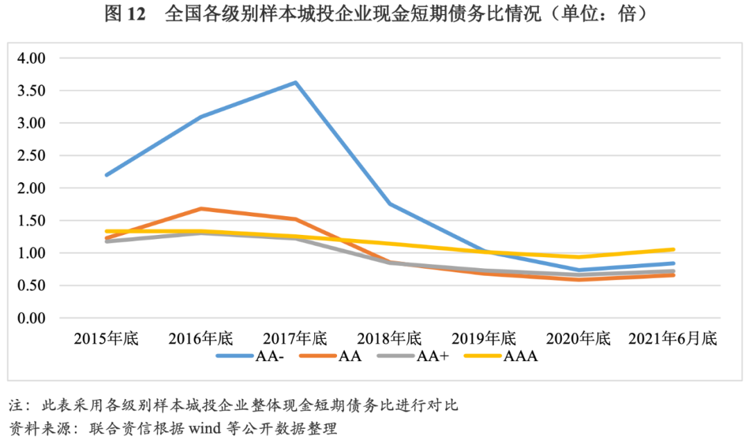 從級(jí)別分布來看,2015-2016年,不同主體信用級(jí)別的樣本城投企業(yè)現(xiàn)金短期債務(wù)比均不同程度上升。2017-2020年,AA-樣本城投企業(yè)現(xiàn)金短期債務(wù)比由2017年底的3.62倍下降至2020年底的0.74倍,降幅最大,主要系自2018年起融資渠道持續(xù)收縮所致;AA和AA+樣本城投企業(yè)現(xiàn)金短期債務(wù)比分別由2017年底的1.52倍、1.22倍降至2020年底的0.59倍、0.66倍,伴隨著債務(wù)的集中到期和融資難度上升,上述級(jí)別城投企業(yè)流動(dòng)性壓力逐年加大;AAA樣本城投企業(yè)融資渠道相對通暢,現(xiàn)金短期債務(wù)比降幅有限,短期償債壓力不大。整體看,融資環(huán)境變化對低級(jí)別樣本城投企業(yè)流動(dòng)性水平影響更為顯著,高級(jí)別樣本城投企業(yè)流動(dòng)性水平在不同融資環(huán)境下變化則相對平緩。