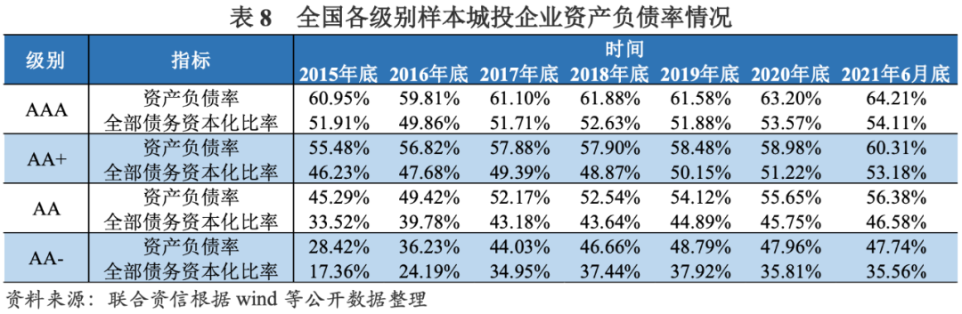 從級(jí)別分布來看,2015-2020年及2021年6月底,級(jí)別越高的樣本城投企業(yè)資產(chǎn)負(fù)債率、全部債務(wù)資本化比率也相對越高。近六年,除了AAA、AA+、AA-樣本城投企業(yè)的資產(chǎn)負(fù)債率、全部債務(wù)資本化比率在個(gè)別年份略有下降外,各級(jí)別樣本城投企業(yè)在2015-2020年均保持上升趨勢;但在去杠桿的進(jìn)程中,AAA、AA+樣本城投企業(yè)兩個(gè)指標(biāo)變化幅度不大,保持較強(qiáng)的韌性;AA、AA-樣本城投企業(yè)兩個(gè)指標(biāo)表現(xiàn)為上升趨勢,但增速自2018年后逐漸趨緩。