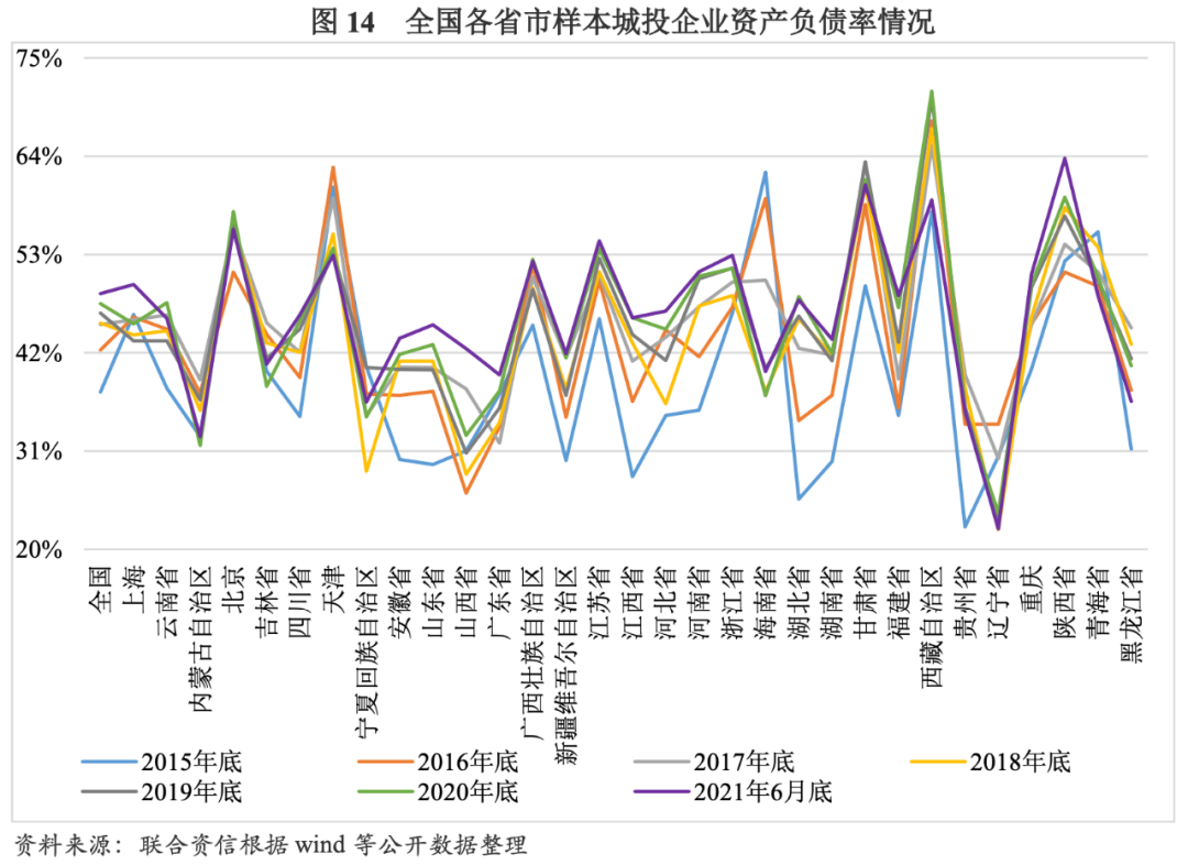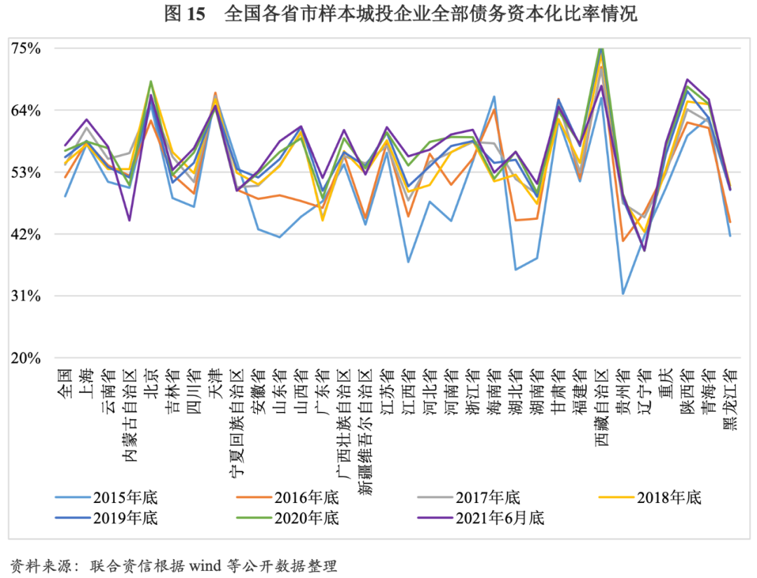 從區(qū)域分布來看,2015-2020年及2021年6月底,在降杠桿背景下各省市樣本城投企業(yè)資產(chǎn)負(fù)債率、全部債務(wù)資本化比率變化趨勢相近,大部分省市呈上升趨勢,但增速開始走緩。其中,地區(qū)生產(chǎn)總值在全國排名前列的區(qū)域,因融資渠道較寬,其城投債發(fā)行規(guī)模也較大,如江蘇、浙江、山東、湖南、四川等區(qū)域,資產(chǎn)負(fù)債率和全部債務(wù)資本化比率上升趨勢較平穩(wěn)。同期,經(jīng)濟(jì)實(shí)力較弱的地區(qū)如遼寧、內(nèi)蒙古、天津、海南,當(dāng)?shù)貥颖境峭镀髽I(yè)普遍存在較大的融資壓力,資產(chǎn)負(fù)債率及全部債務(wù)資本化比率均呈下降趨勢。