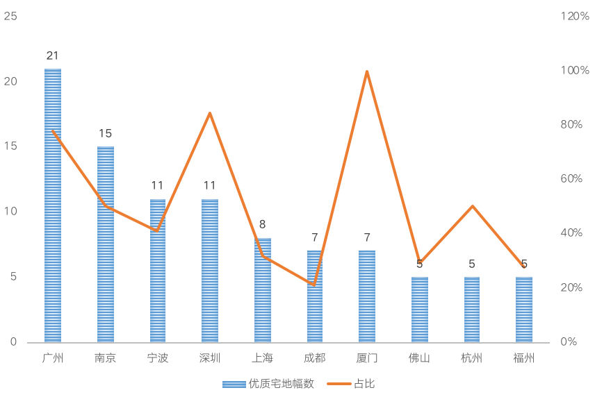 克而瑞研究中心重點監測的90個城市中,有17個城市優質宅地的供應占比超過20%,包括近期土地供應動作較為頻繁的上海、廣州、深圳等一線城市。