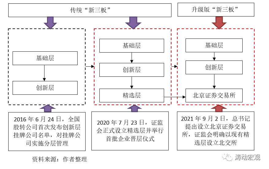 (一)北交所是在現有的新三板精選層基礎上組建,屬于新三板改革的重要內容,即北交所仍可被歸于升級版的“新三板”,具體包括現行的基礎層、創新層以及北交所三個部分。