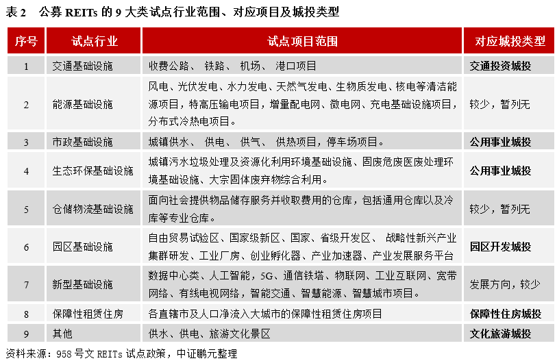 首先根據(jù)業(yè)務(wù)范圍與特點(diǎn),劃分城投主體類型,一一對(duì)照政策要求的試點(diǎn)范圍行業(yè)和發(fā)行要求,城投主體分類與公募REITs試點(diǎn)的行業(yè)范圍詳見(jiàn)表1和表2。