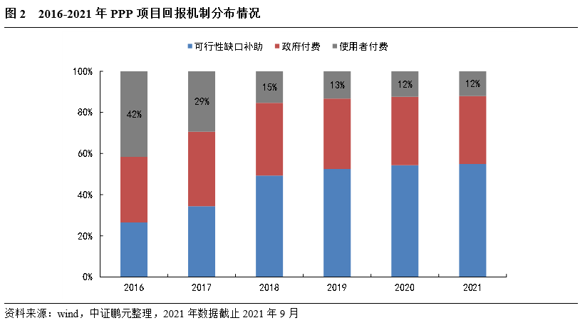 PPP項(xiàng)目發(fā)行REITs目前存在的主要問(wèn)題是滿足收入來(lái)源以使用者付費(fèi)為主的項(xiàng)目數(shù)量較少,且實(shí)際轉(zhuǎn)讓中各類手續(xù)的合規(guī)性問(wèn)題。政策要求PPP項(xiàng)目發(fā)行REITs的底層資產(chǎn):各類手續(xù)合法合規(guī),收入來(lái)源以使用者付費(fèi)為主,項(xiàng)目運(yùn)營(yíng)穩(wěn)健,未出現(xiàn)重大問(wèn)題或合同糾紛。根據(jù)wind中PPP專題庫(kù)統(tǒng)計(jì),截至2021年9月,PPP項(xiàng)目數(shù)13,645個(gè),投資金額198,823.24億元,項(xiàng)目落地率74.73%。其中使用者付費(fèi)項(xiàng)目個(gè)數(shù)1,654個(gè),投資金額26,019.47億元,分別占比12%和13%,圖2可以看出,2016至20220年使用者付費(fèi)項(xiàng)目逐年減少,2021年使用者付費(fèi)項(xiàng)目或許回暖(截至2021年9月,今年使用者付費(fèi)項(xiàng)目占比與去年持平,可能原因跟REITs上市,使用者付費(fèi)項(xiàng)目關(guān)注度增加,更受青睞有關(guān))。另外,PPP項(xiàng)目中需協(xié)調(diào)社會(huì)資本,項(xiàng)目各類手續(xù)是否齊全,是否滿足國(guó)家相關(guān)政策性文件要求,相關(guān)歷史遺留問(wèn)題,均影響PPP項(xiàng)目發(fā)行REITs。