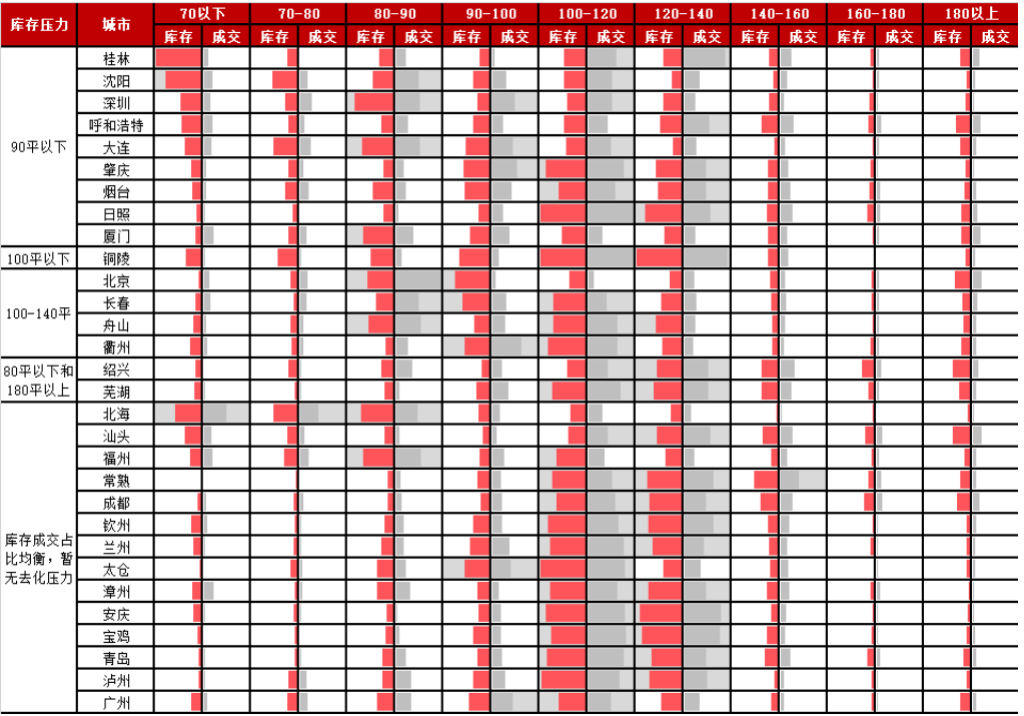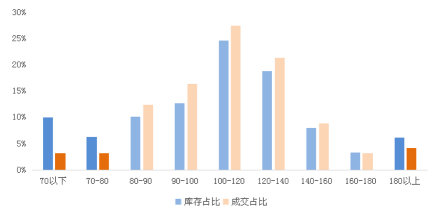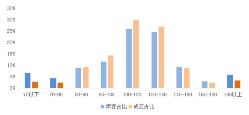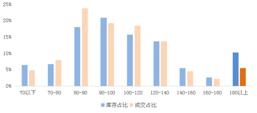其次70平以下、90-100平、140-160平、160平-180平整體庫存占比也略微高于成交占比約1-2個百分點,存在一定的去化風險,但隨著疫后整體成交的穩步復蘇,庫存風險基本可控。