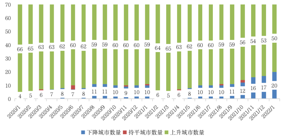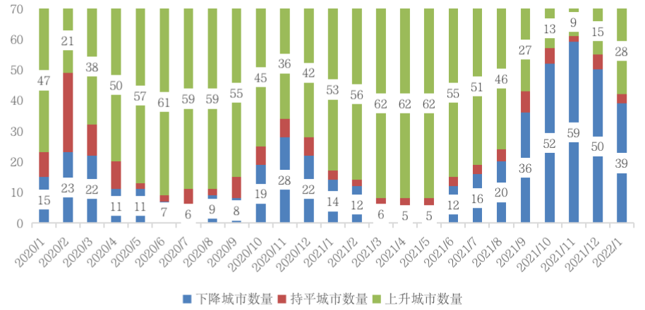 2022年2月21日,國家統(tǒng)計局公布了2022年1月份70個大中城市住宅銷售價格統(tǒng)計數(shù)據(jù)。新建商品住宅銷售價格環(huán)比降勢減弱,環(huán)比下降城市個數(shù)減少。信貸邊際寬松暖風(fēng)陣陣,廣州、寧波、溫州等多個城市房價止跌回升。