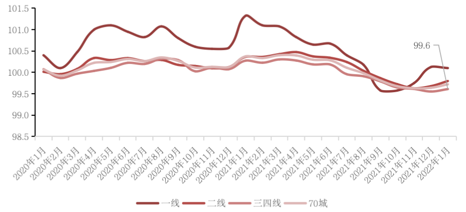 這主要是由于受2021年下半年市場下行影響,至2022年1月三四線城市二手住宅價格仍有0.7%的同比降幅。二手房市場不振下三四線城市購房者不具備充足的購房資金和心理預(yù)期投入新房市場。