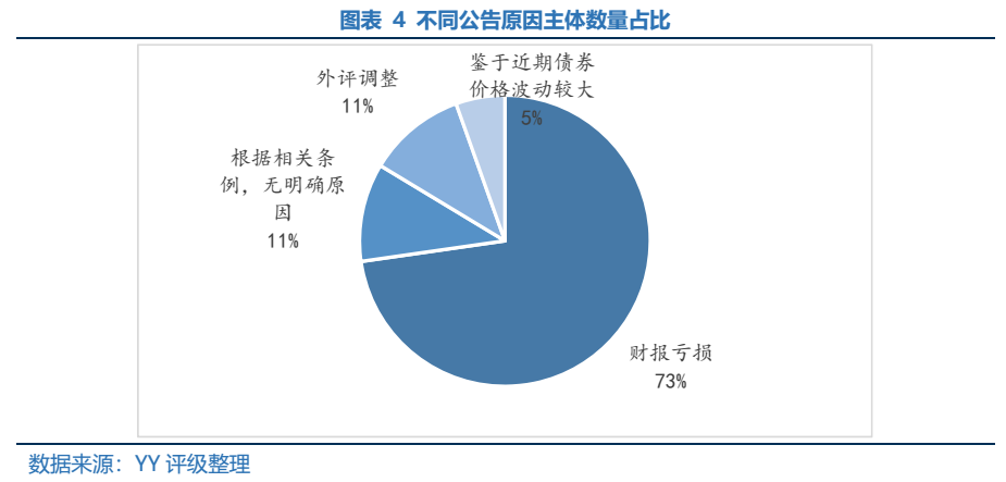 分公告原因來看,主要涉及債券價格波動、財務虧損、外評調整以及其他未說明的原因幾個方面因素。其中財報虧損導致公告的數量占比較高,主體數量占比達到72.7%。