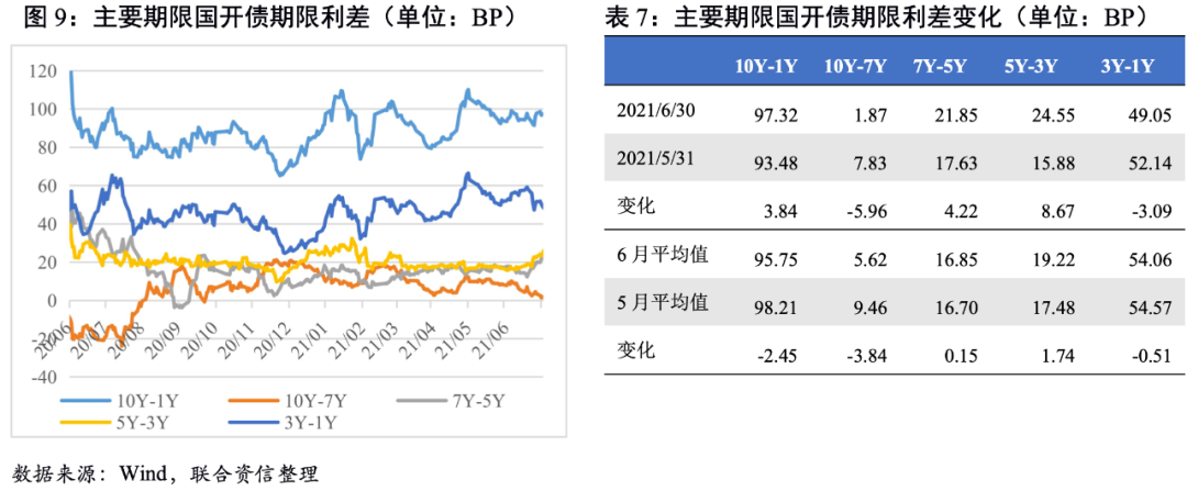 期限利差大多收窄。從期限利差來看,國債10Y-1Y及3Y-1Y期限利差波動較大,都呈現上半月期限利差收窄、下半月期限利差走闊的軌跡。國開債除10Y-1Y期限利差波動較小外,其余期限利差均經歷了較大的波動。整體看,6月主要期限國債和國開債期限利差均值大多較5月收窄,收益曲線趨向平坦化。