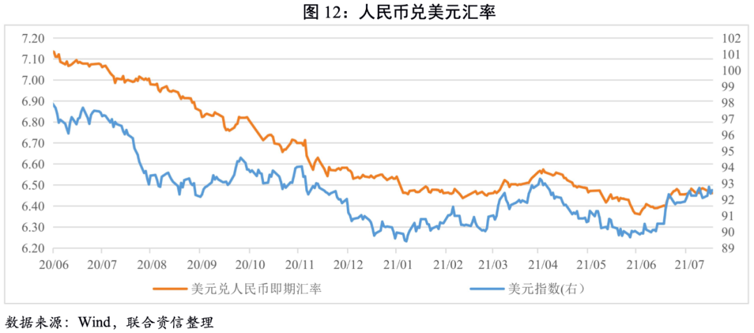 從基本面看,下半年在基數的影響下我國經濟增速逐季下行,而美國隨著疫苗的推廣,經濟有望進一步修復;從貨幣政策端看,6月美聯儲定下了鷹派議息的基調,疊加美國通脹預期抬升。綜合來看,美元指數有望進一步走強,人民幣兌美元匯率或將進入震蕩區間。7月中美利差收窄疊加美元指數的走強,人民幣匯率或將小幅貶值,預計7月美元兌人民幣匯率區間大致為6.39~6.52附近。短期內需要關注利率債跨國投資風險。