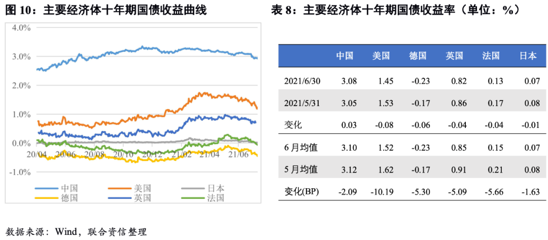 截至6月末,我國與主要經濟體的利差較5月末均進一步走闊,其中與美國的利差上升幅度最大。6月美國十年期國債收益率整體呈震蕩下行走勢,由1.58%下行至1.45%,主要是由于月初非農就業不及預期,市場修正對前期經濟增長樂觀的預期。三季度美國經濟預期較為樂觀,同時美聯儲釋放鷹派信號疊加美國通脹超預期上行,綜上分析預計三季度美債收益率有望重回上行渠道,中美十年期國債利差或將有所收窄。除美國外,6月我國與德國、英國和法國的十年期國債利差均值均有所上升,與日本利差則小幅收窄,日本國債利率下行幅度小于我國。