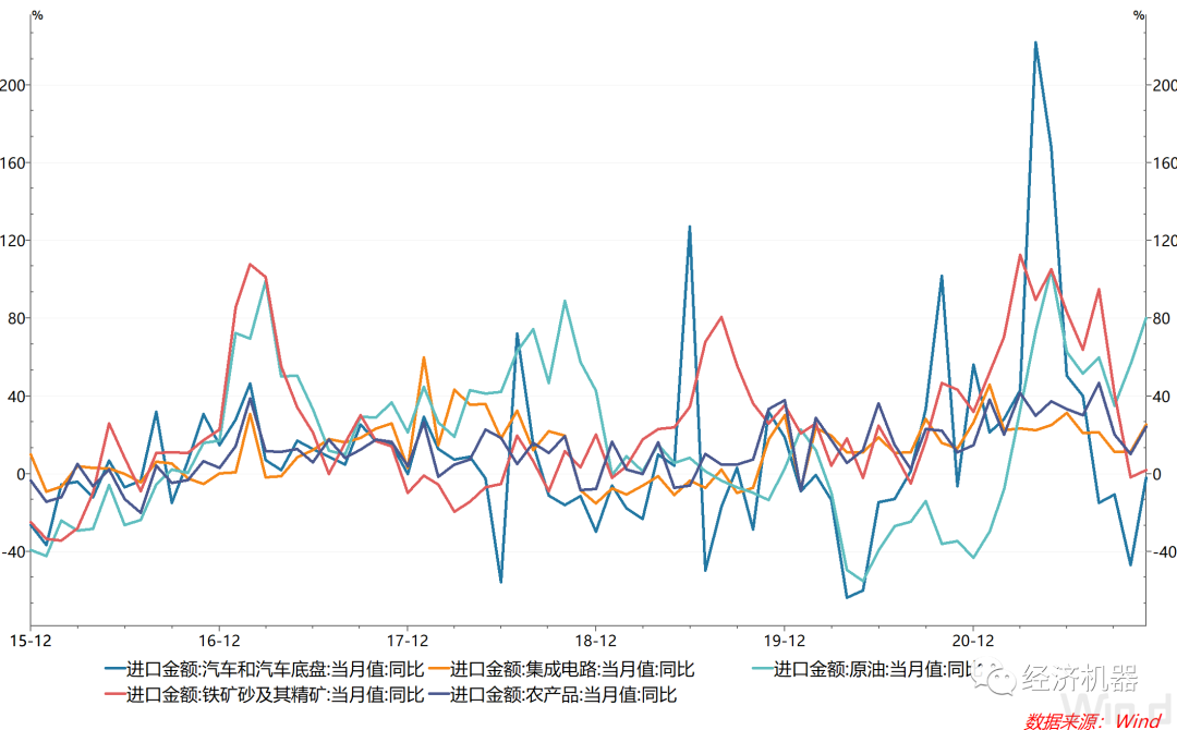此外,隨著能源短缺的緩解,生產(chǎn)恢復(fù)也帶動了進口需求。上中下游(如汽車、集成電路、原油、農(nóng)產(chǎn)品等)進口增速均有不同程度的提升(圖2)。