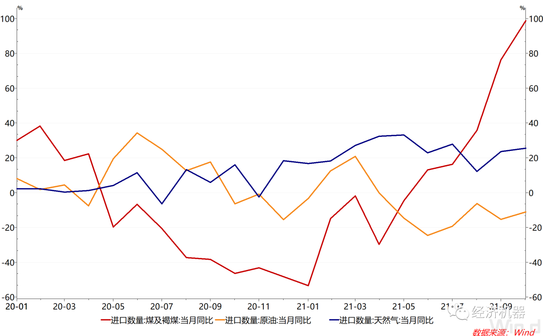 進口表現(xiàn)大幅超預(yù)期。11月,我國進口2538.1億美元,同比增長31.7%,較上月提升11.1個百分點,遠高于預(yù)期的18.2%。這或許得益于我國能源保供政策的強力推進。10月份以來,我國加快對煤炭等大宗商品進口的清關(guān)速度,以緩解國內(nèi)能源短缺。11月,我國進口煤約3500萬噸,環(huán)比增長30.11%,同比增長98.7%(圖1)。能源保供下,部分大宗商品進口暴增,或許是進口超預(yù)期的重要推動因素。