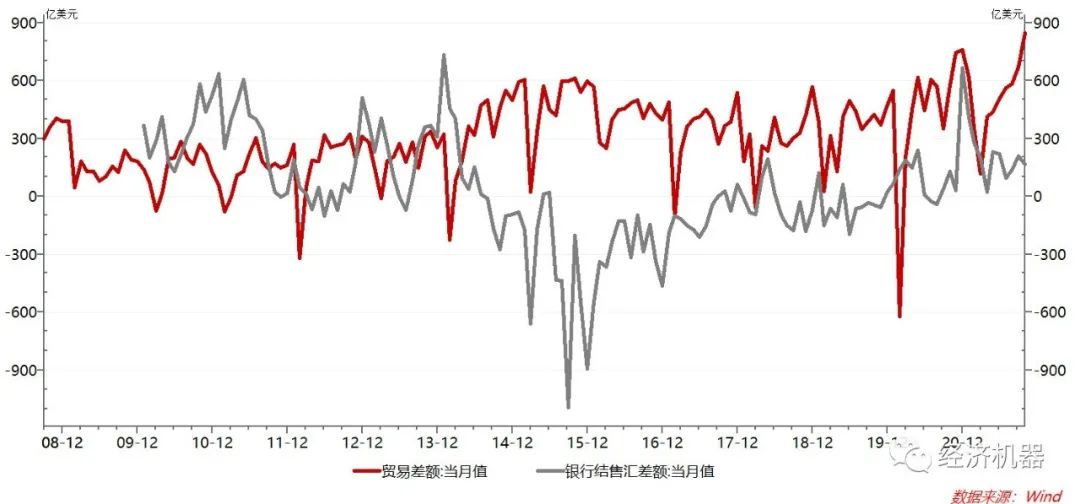 圖4 貿(mào)易差額與銀行結(jié)售匯差額