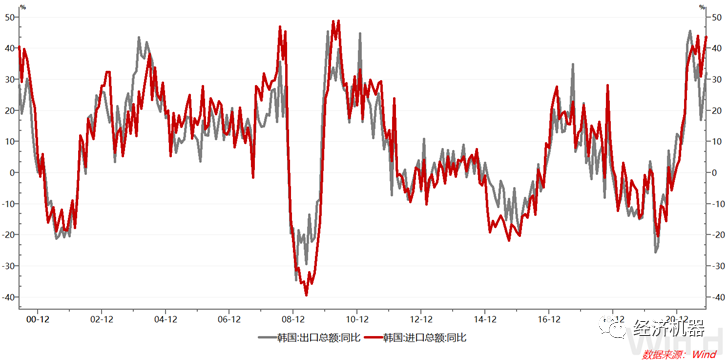 作為全球經(jīng)濟金絲雀的韓國,其進出口增速是全球貿(mào)易的晴雨表,近期也持續(xù)回升。11月韓國出口同比增長32.1%,較上月加快8個百分點,進口同比增長43.6%,較上月加快5.9個百分點,均連續(xù)兩月回升,進口同比增速更是接近8月份的高點,這也表明全球經(jīng)濟短期增長無憂(圖7)。