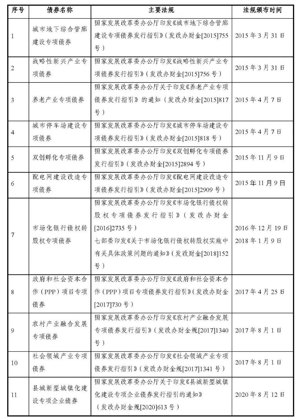 專項債券是國家發(fā)改委2015年開始推出的創(chuàng)新企業(yè)債券產(chǎn)品,2015年推出了6個專項債券品種,2016年推出了1個專項債券品種,2017年推出了3個專項債券品種,2018年至2019年無無新的專項債券品種,2020年推出了1個專項債品種。目前國家發(fā)改委專項債券已經(jīng)有11個品種,主要監(jiān)管法規(guī)和推出時間詳見下表: