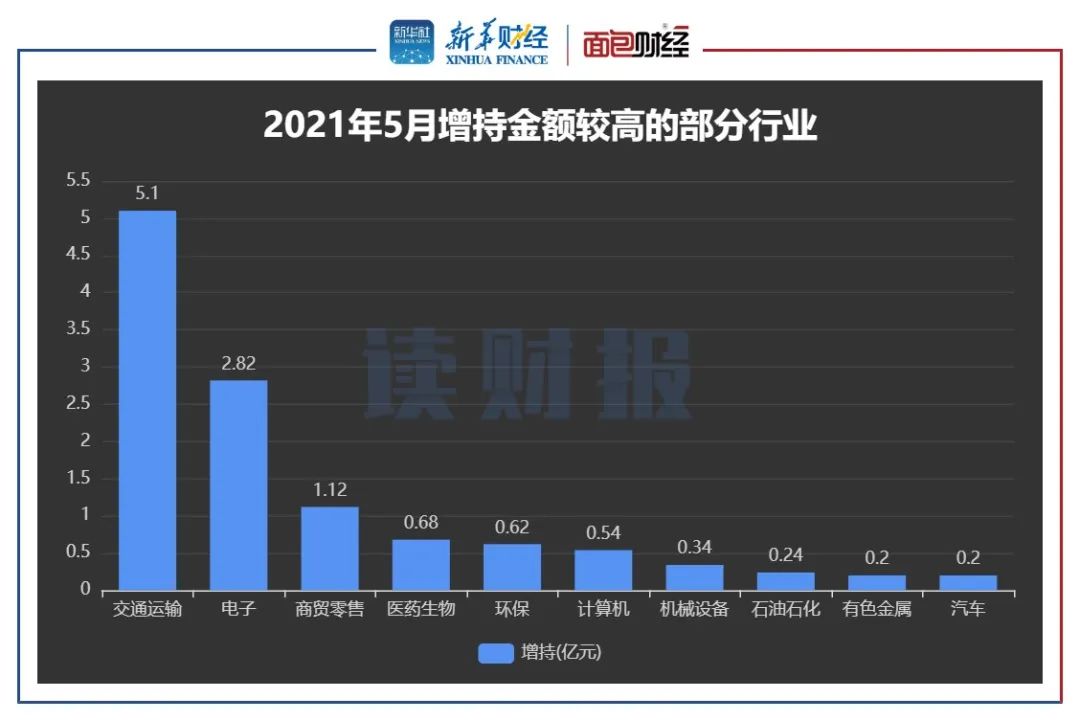 5月份,各行業(yè)中,石油石化行業(yè)增持金額均居首位,交通運(yùn)輸行業(yè)增持金額最多。