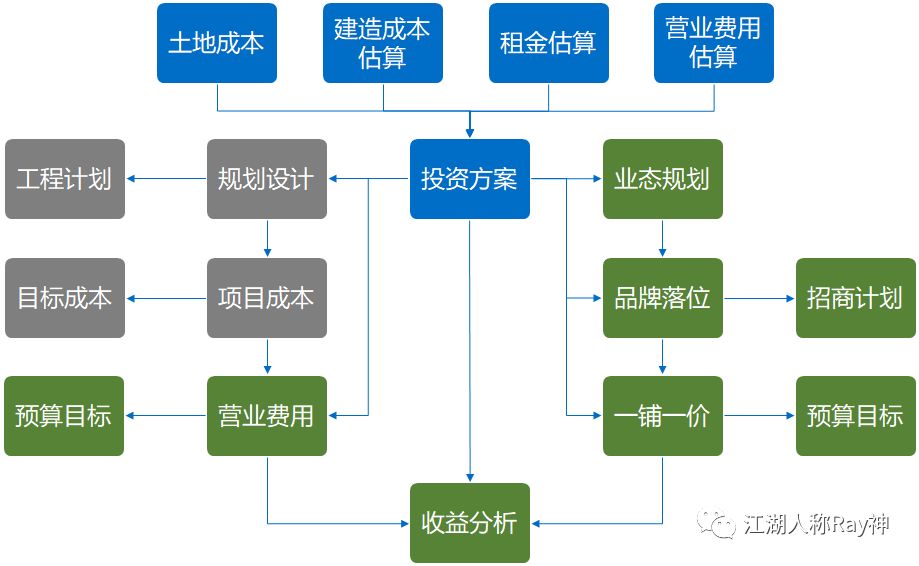 對于這一過程,行業內通常會通過投策定案來進行管理,但往往出現的問題就是投策與運營脫節,制定的目標無法在運營期落地。因此,問題的關鍵也就是在解決如何把投資方案與運營方案協同起來。以購物中心為例,這一協同就涉及到我們如何進行業態規劃、品牌落位和一鋪一價的制定,進而落實到可執行的招商計劃和預算目標上。
