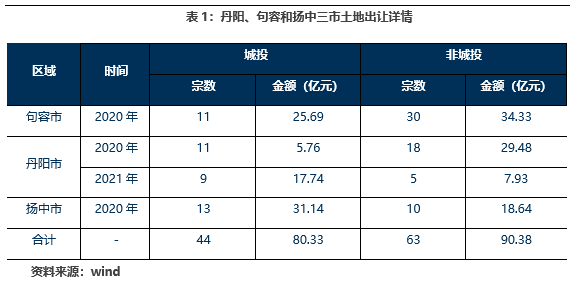 丹陽市20年經營性土地出讓29宗,收入為35.24億元,其中城投規模11宗5.76億元,;21年出讓14宗,收入為25.57億元,其中城投規模9宗17.74億元,占絕大多數;城投購買主體以丹陽高新投、丹陽投資以及丹陽經開為主。