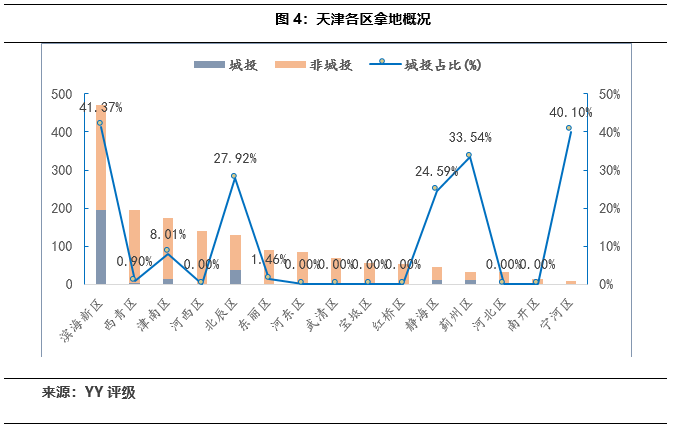而具體到區域和明細而言,濱海新區土地出讓收入規模高,同時城投拿地占比在41.37%,遠高于直轄市其他區;從具體的明細而言,天津生態城投資拿地38宗,出讓金規模達114.79億元,占濱海新區城投拿地的59%左右。