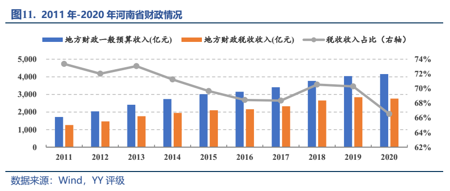 財(cái)政上看,2020年河南省一般公共預(yù)算收入4,155.20億元,增長(zhǎng)2.80%;稅收收入2,764.66億元,下降2.70%,占一般公共預(yù)算收入的比重為66.50%。