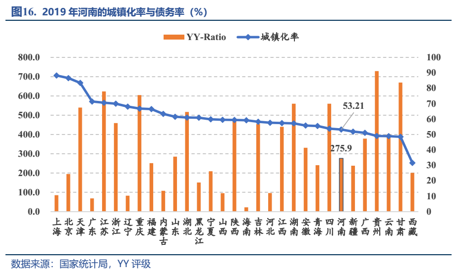 那么未來(lái)的河南到底怎么走?回溯過(guò)往,千百年來(lái),中原大地鋪滿濃重的農(nóng)耕底色,農(nóng)業(yè)大省的定位讓其城鎮(zhèn)化率始終處于低水平區(qū)間,2017年首次突破50%,而2019年公布的河南城鎮(zhèn)化也僅為53.21%,遠(yuǎn)低于全國(guó)60%的平均水平,位列倒數(shù)第五,未來(lái)政府建設(shè)、投資的空間較大。在舉債驅(qū)動(dòng)城鎮(zhèn)化發(fā)展的模式下,河南相應(yīng)的債務(wù)水平也處于低位線,2019年河南省YY-Ratio為275.9%,從低到高排名全國(guó)第十五。
