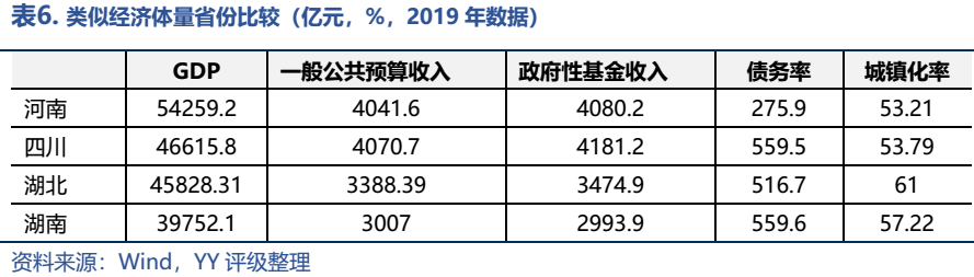 相比類似或稍弱經(jīng)濟(jì)體量的省份,四川、湖北、湖南的債務(wù)率均超過(guò)了500%,而河南的債務(wù)率不到300%,留有較多撬動(dòng)杠桿的空間。