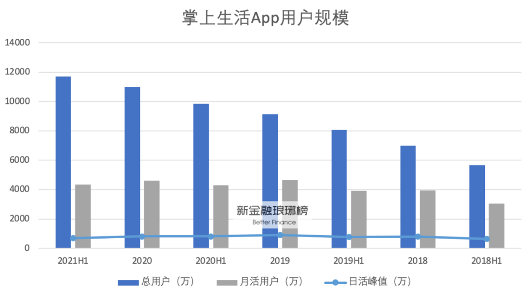 如果把數據再往前拉,掌上生活App在今年上半年的日活峰值,基本倒退到了2018年上半年。盡管,三年間該App累計用戶增長接近5000萬戶。