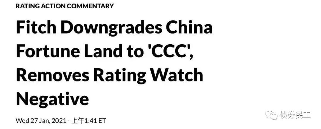 根據(jù)國(guó)際評(píng)級(jí)機(jī)構(gòu)惠譽(yù)評(píng)級(jí)1月27日的評(píng)級(jí)公告,惠譽(yù)評(píng)級(jí)將華夏幸福的高級(jí)無抵押評(píng)級(jí)從B下調(diào)至CCC,同時(shí)將公司移出負(fù)面評(píng)級(jí)觀察名單。在惠譽(yù)評(píng)級(jí)下調(diào)之前,國(guó)外評(píng)級(jí)機(jī)穆迪公司已于2020年9月17日將華夏幸福的評(píng)級(jí)展望調(diào)整為負(fù)面。