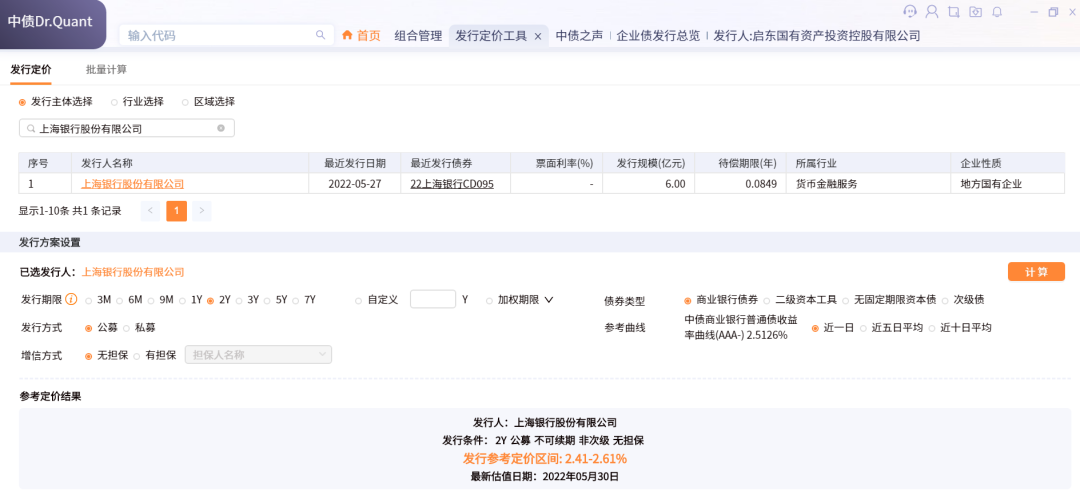 根據(jù)中債Dr Quant的計(jì)算結(jié)果,上海銀行發(fā)行2年期同期限債券的票面利率區(qū)間只有2.41%~2.61%,遠(yuǎn)不如買新城控股的債+上海銀行設(shè)立的CRMW,如果我是個(gè)理性投資人,肯定是選擇后者。
