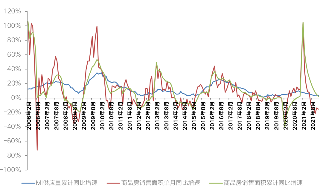 圖:2006年至今M1供應(yīng)量累計同比增速、商品房銷售面積單月及累計同比增速