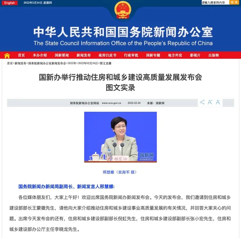 2022年2月24日,國新辦舉辦“推動住房和城鄉(xiāng)建設(shè)高質(zhì)量發(fā)展發(fā)布會”,提出重點抓好加強房地產(chǎn)市場調(diào)控、推進住房供給側(cè)結(jié)構(gòu)性改革、實施城市更新行動、實施鄉(xiāng)村建設(shè)行動、落實碳達峰碳中和目標(biāo)任務(wù)、推動建筑業(yè)轉(zhuǎn)型升級、推動改革創(chuàng)新和法治建設(shè)、加強黨的建設(shè)等工作,推動住房和城鄉(xiāng)建設(shè)事業(yè)高質(zhì)量發(fā)展。