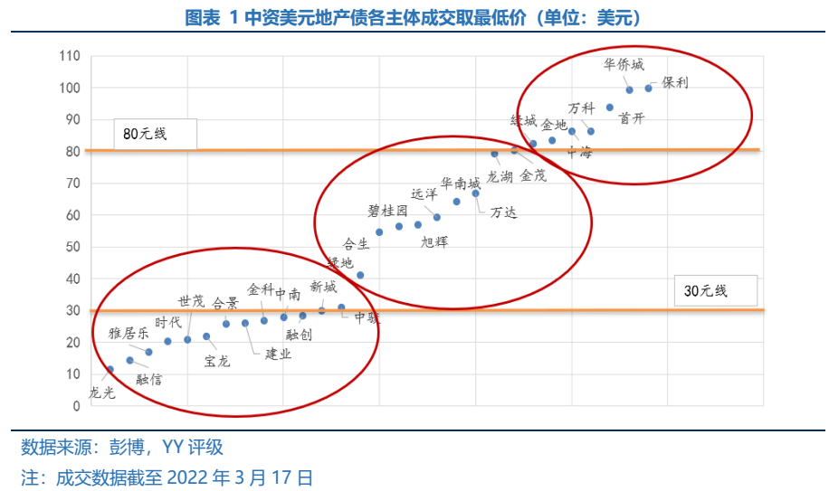以境外美元債為例,尚未正式違約的主體,截至3月17日,最低價30元以下的主體包括展期的龍光,世茂以及融信、時代等,融創(chuàng)、新城同樣在30元附近掙扎。碧桂園、旭輝、混改的遠(yuǎn)洋、綠地分布在30-60元間,民企龍頭龍湖與多數(shù)央國企最低價在80元以上。