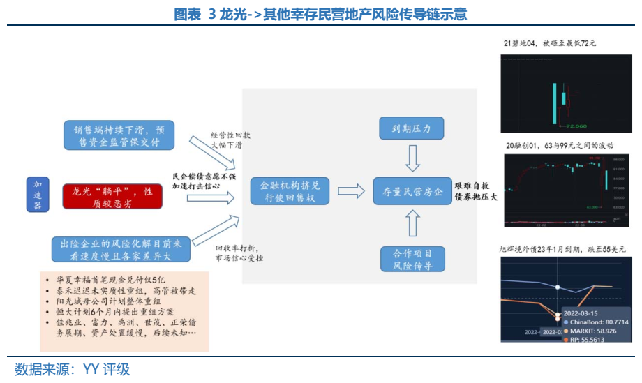 龍光憑一己之力帶崩其他幸存小伙伴,償債意愿難被證實或證偽,金融機(jī)構(gòu)到期不續(xù)或?qū)徟瓿珊笥^望不放款進(jìn)一步擠壓剩余民營房企生存空間,負(fù)循環(huán)難停,信用債生態(tài)體系被破壞。