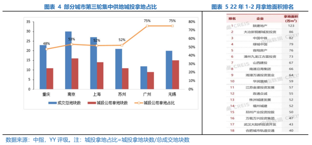 在較強的流動性壓力約束下,多數(shù)民營房企自21年下半年來就鮮少拿地,其市場份額被其他國企央企開發(fā)商以及區(qū)域城投所占據(jù),廣州、無錫等城市第三輪集中供地中城投拿地占比達(dá)到了75%。22年1-2月的拿地建面看,城投參與拿地的積極性仍在延續(xù),其背后體現(xiàn)的依舊是政府救市的意志,在地產(chǎn)下行周期里為降低流拍率,穩(wěn)定土地價格的“托底”行為,也與城投謀求市場化轉(zhuǎn)型相契合。
