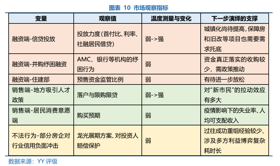 可以從市場和主體兩個維度進(jìn)行觀察:一方面,結(jié)合銷售起色和融資配套感知溫度變化,另一方面,觀察出險企業(yè)紓困進(jìn)展、對流動性緊張民企的外力救助以及對不法事件的問責(zé),衡量對市場的潛在沖擊。