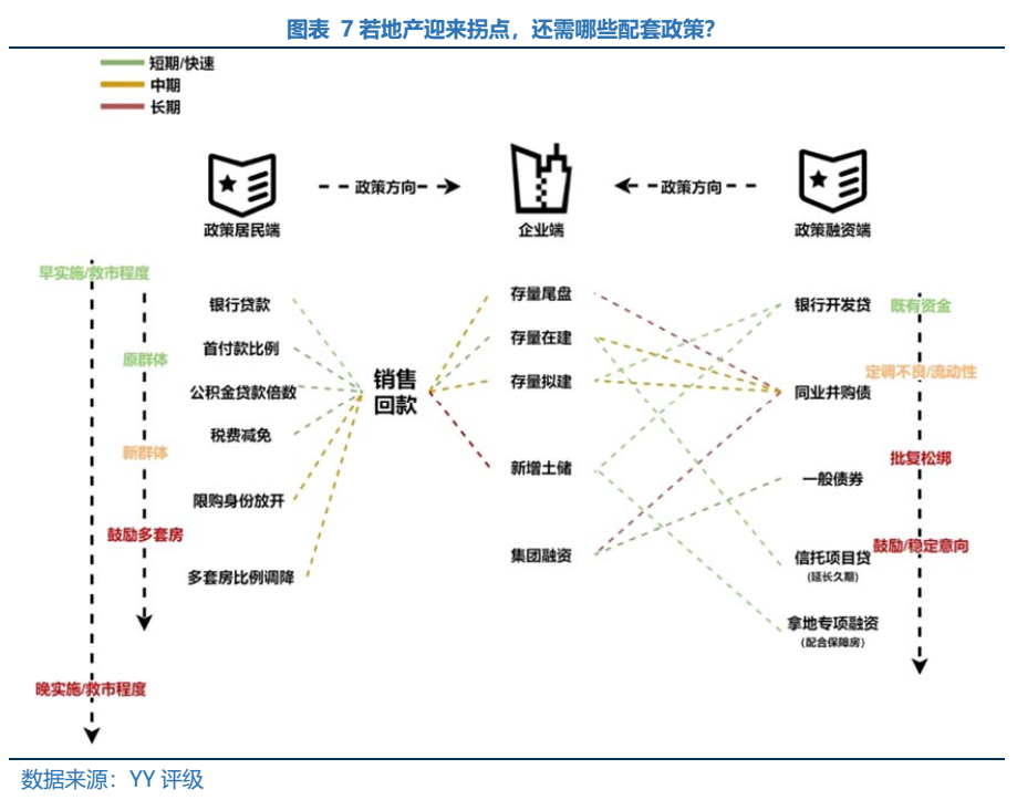 具體路徑來看,根據(jù)前文提到的風(fēng)險傳遞鏈條,銷售止跌、樓市回暖是信心扭轉(zhuǎn)的根基,也是房企融資回暖的最大前提條件。在銷售端拐點持續(xù)確認(rèn)的前提下,配合合適的融資政策效果會更顯著。房地產(chǎn)開發(fā)資金中超50%來自于預(yù)收款和個人按揭貸,故需要政策推動下的需求端企穩(wěn)->銷售款回升->房企來自預(yù)售和按揭貸款增加->其他融資渠道風(fēng)險偏好回升->企業(yè)現(xiàn)金流實質(zhì)性好轉(zhuǎn)。