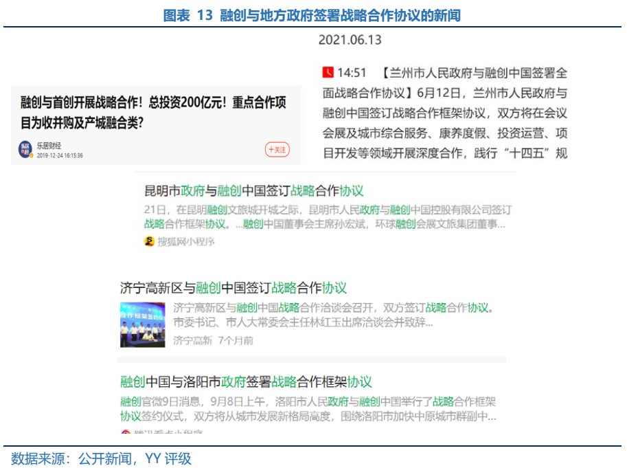05 與地方國企合作較密切,影響范圍更廣。融創(chuàng)近年來土儲權(quán)益比在下滑,市場討論較多的也是其與地方國企合作更為密切,通過聯(lián)合營放大經(jīng)營杠桿,借助合作方的力量鋪開規(guī)模,占據(jù)市場,獲得更多當(dāng)?shù)刭Y源支持。根據(jù)公開新聞,融創(chuàng)與包含昆明、蘭州、洛陽、三亞、桂林等多地政府簽署戰(zhàn)略合作框架的次數(shù)要遠(yuǎn)高于碧桂園、龍湖等企業(yè),側(cè)面反映其與地方的關(guān)聯(lián)度較深。另一方面也解釋了融創(chuàng)向央行尋求支持的行為。