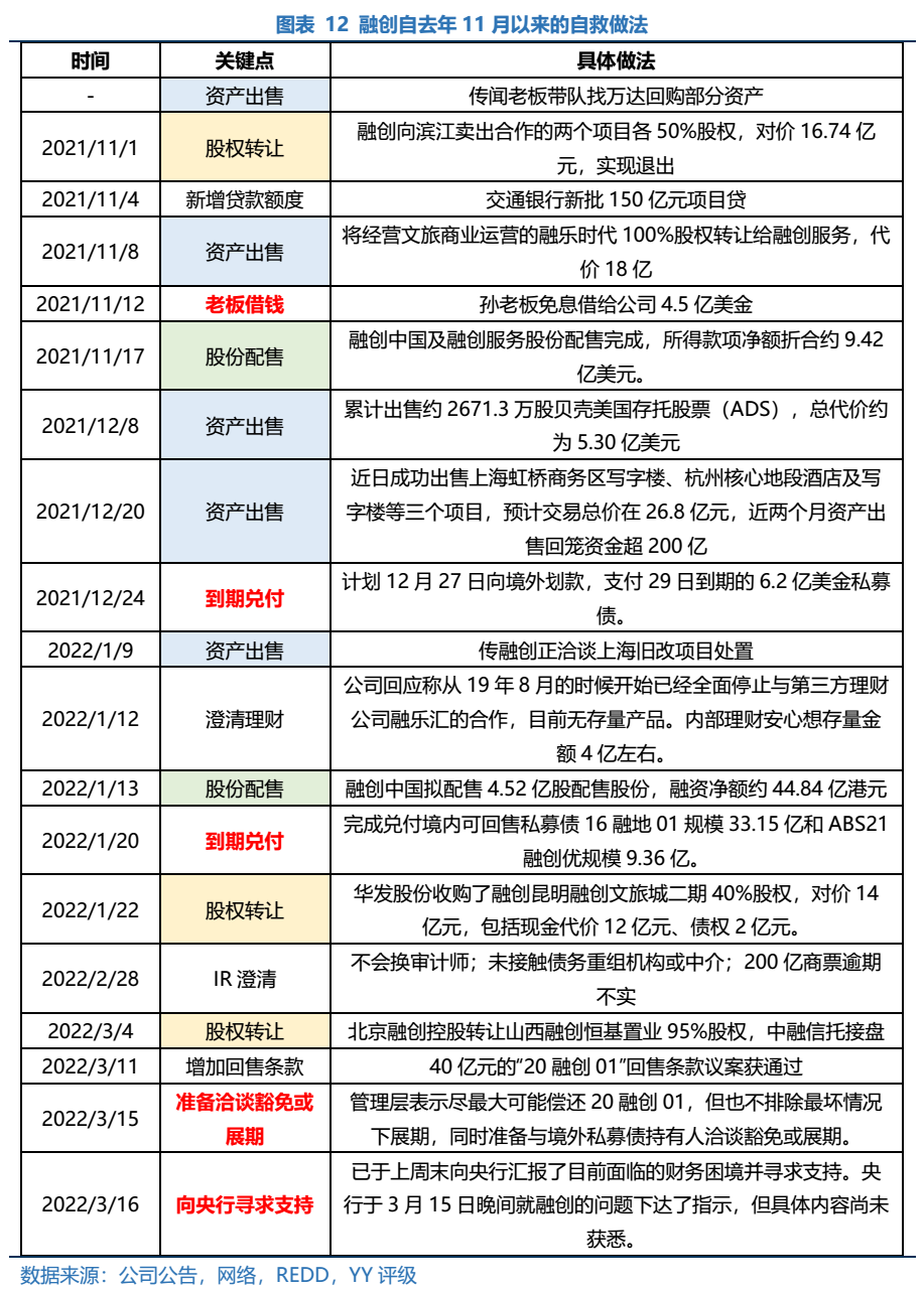 04 研判其努力程度:融創(chuàng)較早就開始了各種渠道的自救,稱得上努力。在行業(yè)多重利空打壓、外評接連下調(diào)下,公司的自救行為絕大程度體現(xiàn)了實控人孫老板個人較強的償債意愿。雖偶有傳出商票逾期,但整體看公司通過多次配股、股權(quán)轉(zhuǎn)讓、資產(chǎn)處置以及老板無息借款等方法提供流動性,相比多數(shù)已展期或“躺平”的民企來說,已算盡力。