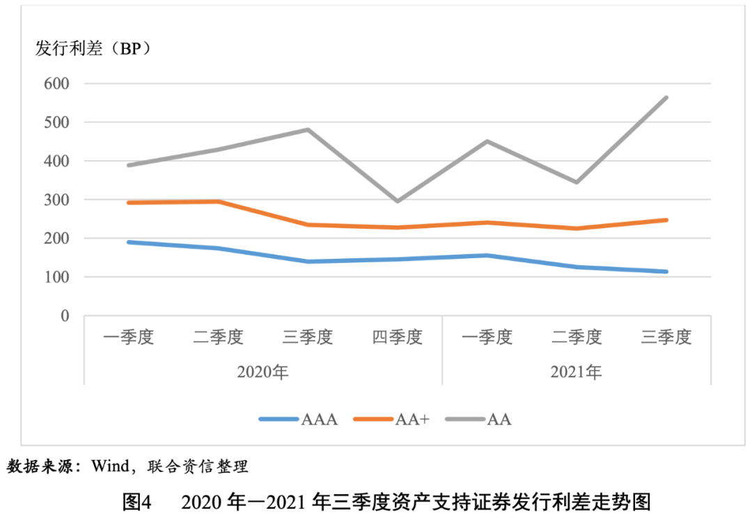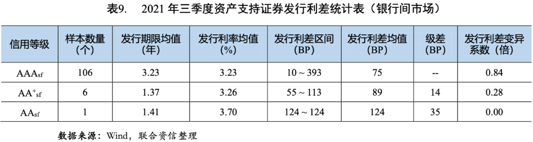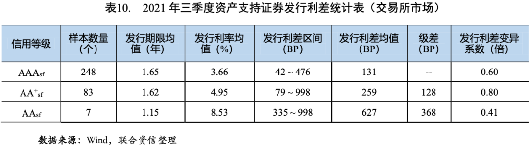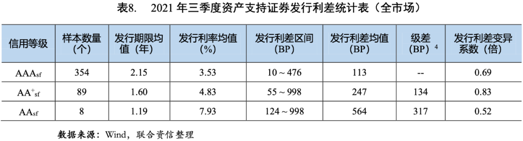 2021年三季度,資產支持證券的發行利率和利差均值均隨信用等級的下降而上升(見圖3和圖4),說明信用評級對資產支持證券的信用風險具有較好的區分度。AAAsf、AA+sf和AAsf級資產支持證券的發行利差均值分別為113BP、247BP和564BP,AAAsf級資產支持證券的發行利差均值環比下降12BP,同比下降26BP;AA+sf和AAsf級資產支持證券的發行利差均值環比分別上升22BP和220BP,同比分別上升13BP和84BP。AAAsf級和AA+sf級之間的級差為134BP,同比、環比均有所上升,反映了在經濟恢復趨緩背景下,市場不確定性上升,投資者對低級別資產支持證券要求的風險溢價進一步提高;AA+sf級和AAsf級之間的級差為317BP,可能與AAsf級資產支持證券樣本數目過少而缺乏代表性有關。AA+sf級資產支持證券的發行利差的變異系數相對較高,說明投資者對AA+sf級資產支持證券的信用風險判斷存在分化。