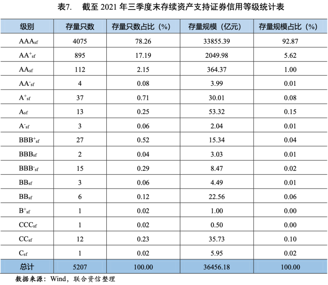 截至2021年三季度末,在存量資產支持證券中,有5207只具有信用評級,集中于AAAsf、AA+sf和AAsf三個等級。AAAsf級、AA+sf級和AAsf級資產支持證券的存量只數占比分別為78.26%、17.19%和2.15%,存量規模占比分別為92.87%、5.62%和1.00%(見表7)。