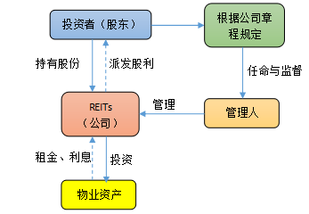 公司型REITs是指通過設立以房產投資為經營范圍的公司,將公司股份出售給投資人,公司再將收益以股利形式分配給投資人。