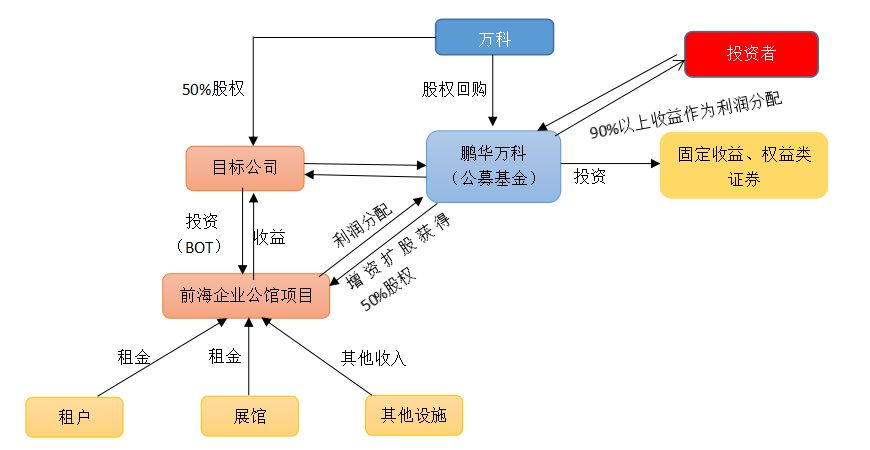 在一定意義上,前海萬科REITs是首只公募REITs的嘗試。上市首日,基金交投活躍,成交額超過5000萬元。發行期間單個投資者的單筆認購門檻為10萬元。產品成立并上市后,在二級市場1萬元即可參與交易。其標的資產主要是萬科前海企業公館未來8年的租金收益權。投資分為兩部分,其一是投資于目標公司,比例不超過基金資產的50%;另一部分將投資于固定收益類資產、權益類資產等,比例不低于基金資產的50%。其中,對于目標公司的投資是通過增資方式持有目標公司50%的股權至2023年7月24日,由此獲取自2015年1月1日起至2023年7月24日期間前海企業公館項目100%的租金收益權。