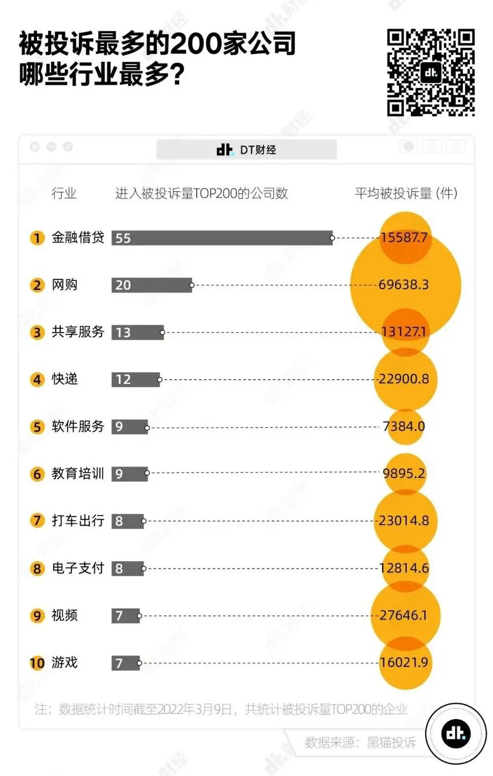 DT財經統計了黑貓平臺上的消費者投訴信息,針對被投訴最多的200家公司展開進一步研究。