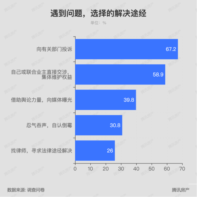 騰訊房產的調研顯示,大部分消費者會通過向有關部門投訴、雙方直接交涉、向媒體曝光借助輿論力量、尋求法律幫助等途徑和方式維護自己的合法權益。